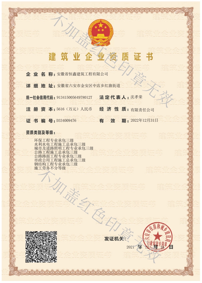 公司目前主要的資質范圍:建筑工程施工總承包二級,市政公用工程總承包三級、水利水電工程施工總承包三級,公路工程施工總承包三級;建筑裝修裝飾工程專業(yè)承包二級,電子與智能化工程專業(yè)承包二級、建筑幕墻工程專業(yè)承包二級,城市及道路照明專業(yè)承包三級、鋼結構工程專業(yè)承包三級,公路路面工程專用承包三級。